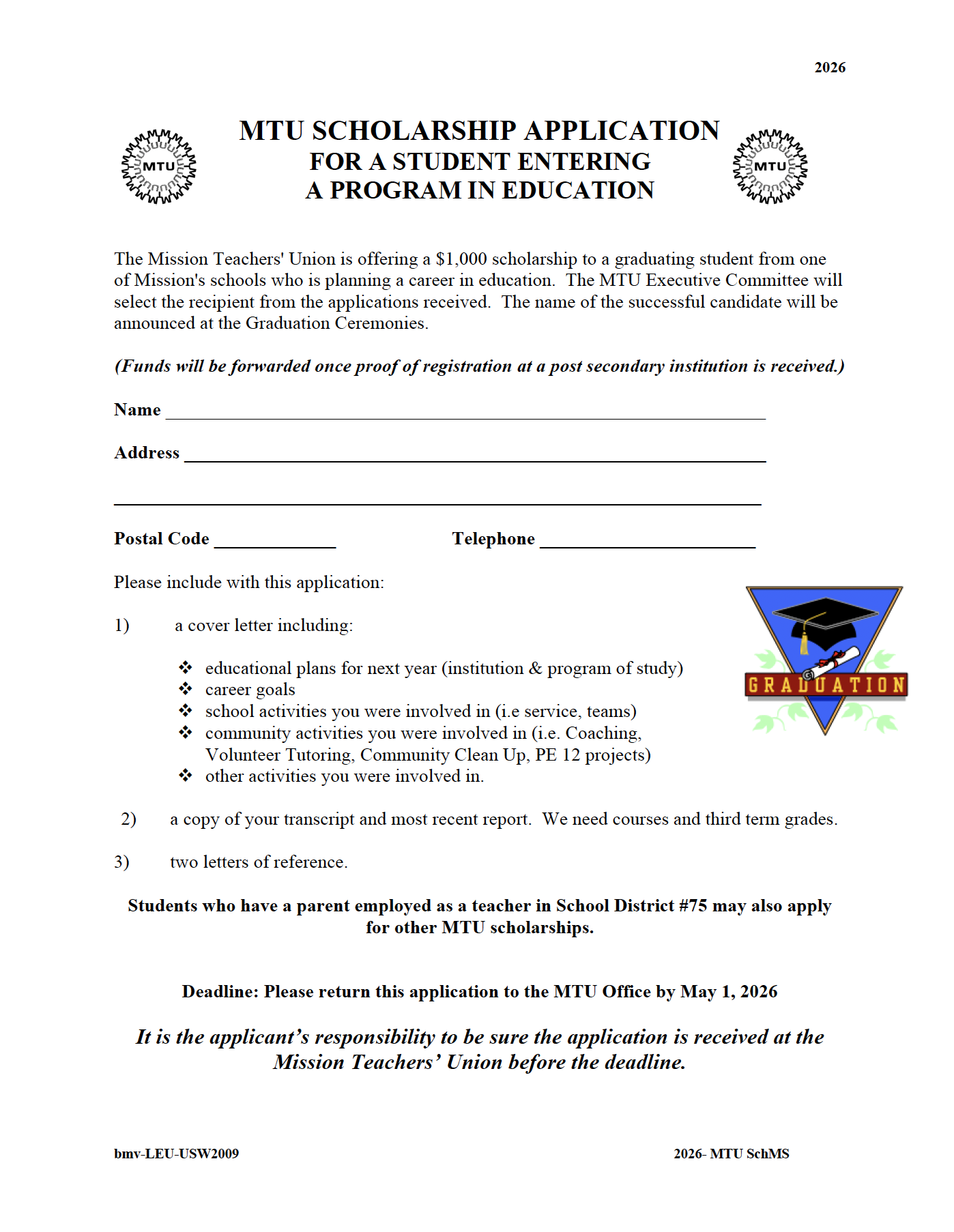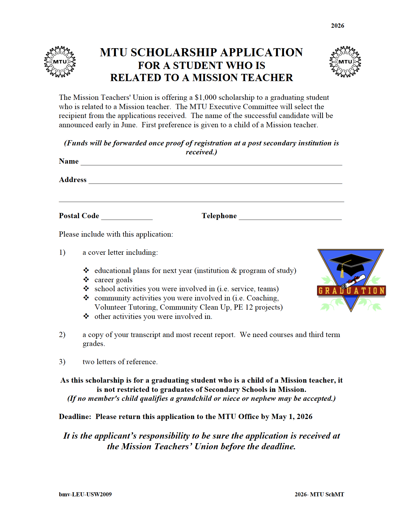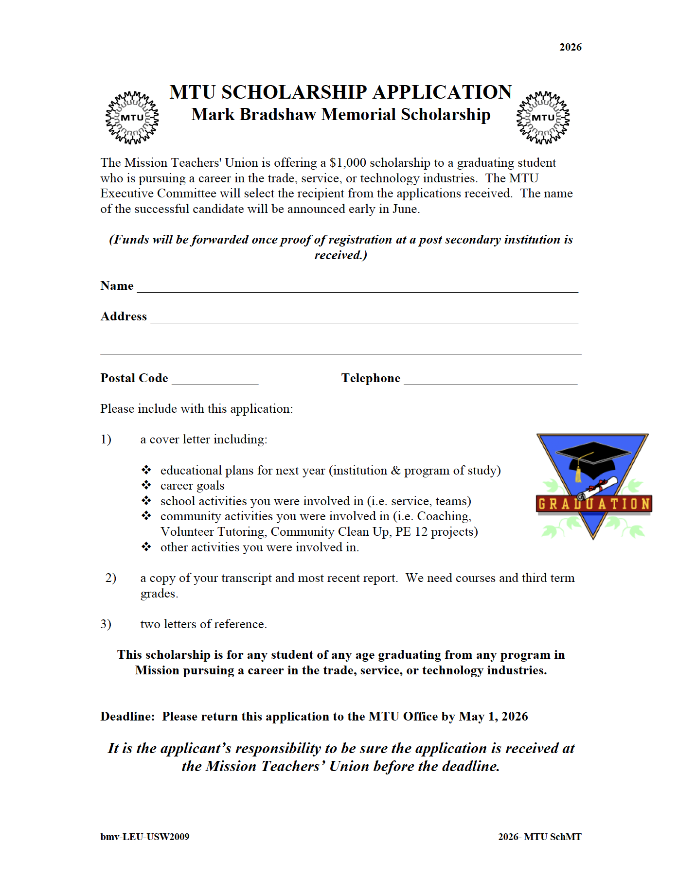 MTU Documents Collective Agreement CONSTITUTION POLICIES MTU Scholarships A STUDENT ENTERING A PROGRAM IN EDUCATION A STUDENT WHO IS RELATED TO A MISSION TEACHER MARK BRADSHAW MEMORIAL SCHOLARSHIP